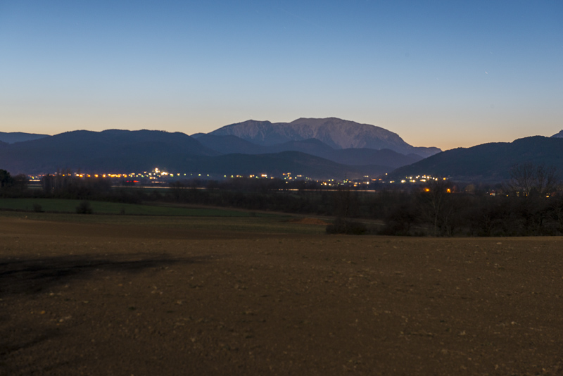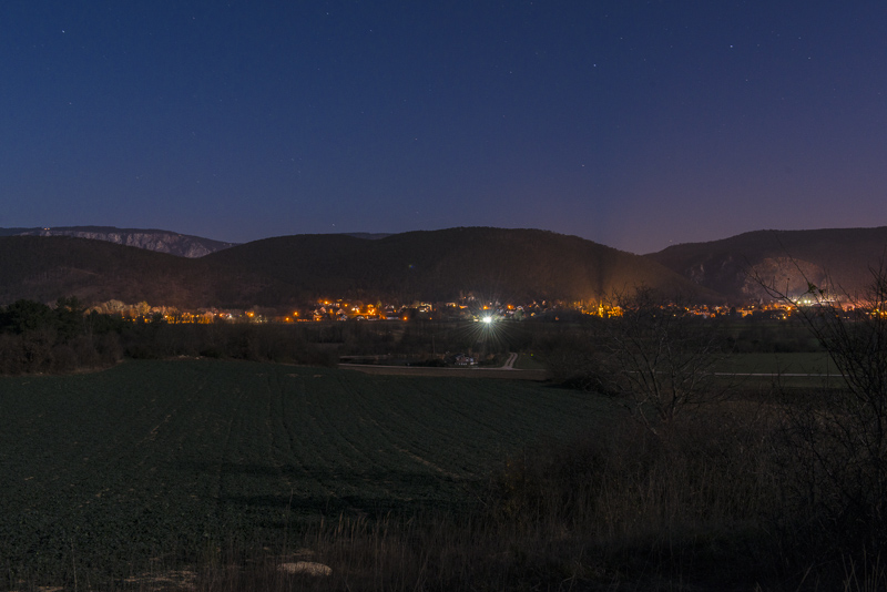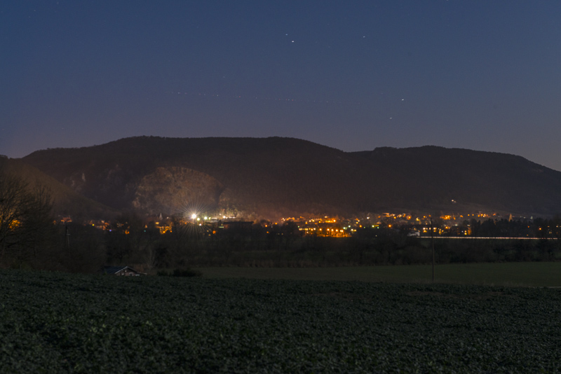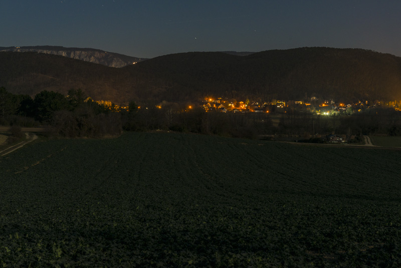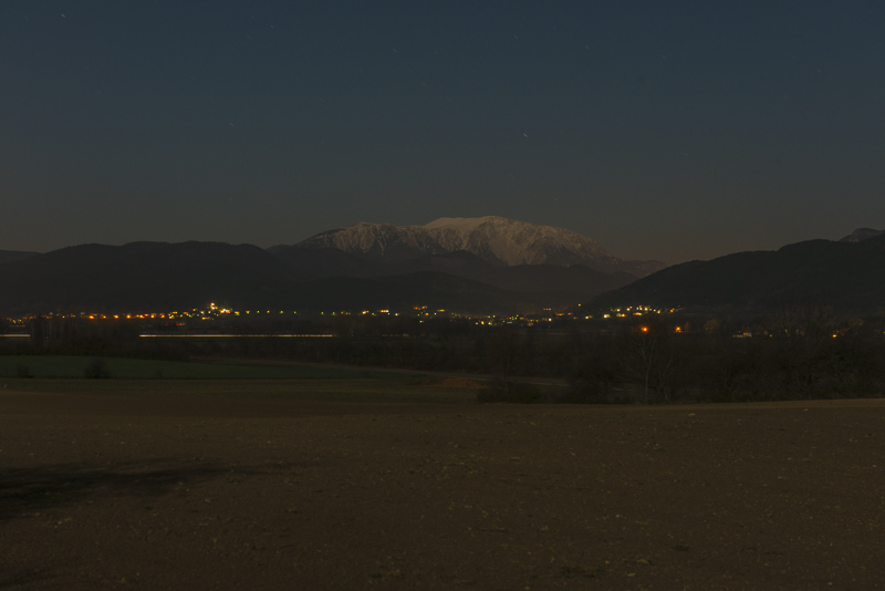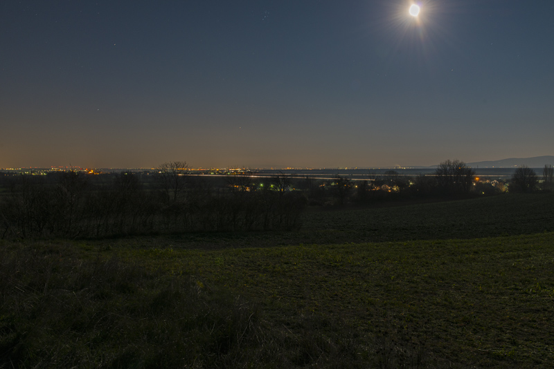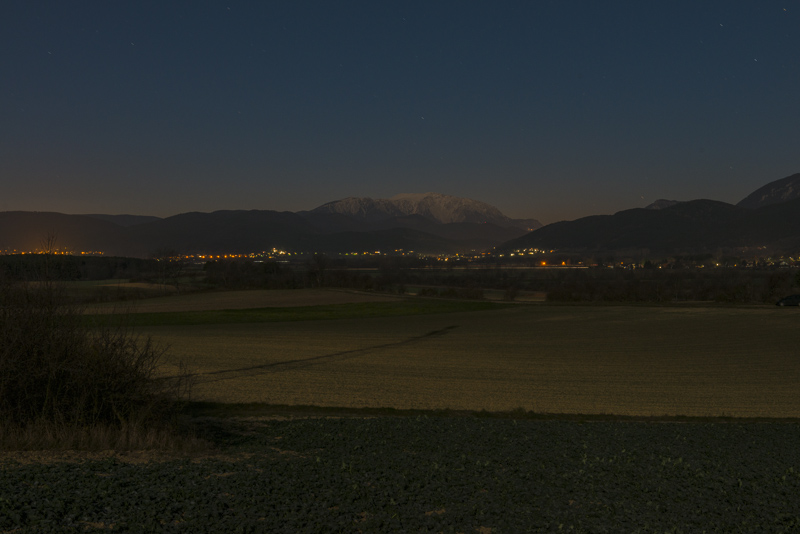 Nach einem fast wolkenlosen Tag eine klare Nacht und ein fast voller Mond. Da der Schneeberg oben schneebedeckt ist und jetzt sicher im Mondlicht erstrahlt, probiere ich mal was Neues und fahre mit dem Auto und Kamera und Stativ zu einem guten Aussichtsplatz. Es hat jetzt unter 0 Grad, keine sehr angenehme Temperatur.
