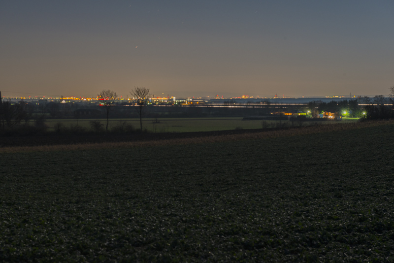 Blick Richtung Wiener Neustadt. Helle Streifen wo die Autobahn verläuft, bei Langzeitbelichtung.