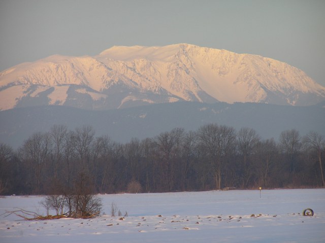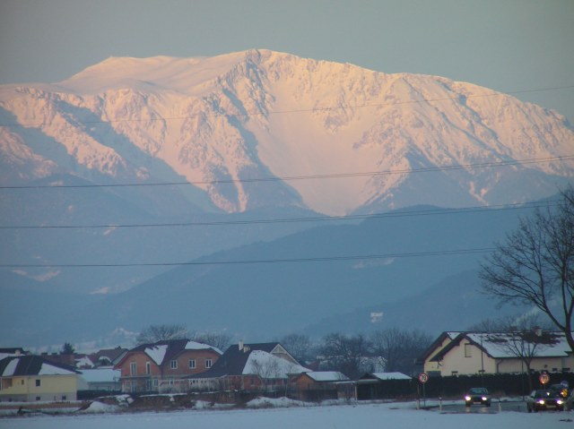 Breakup in the first morning light in direction Wechsel. Wiener Becken is still in shadow, but Schneeberg shines resplendent in the pink light of early morning sun. Unfortunately, the temperature is between -14 and -17 C, so you cannot leave your car for taking pictures without freezing your fingers.