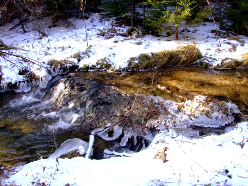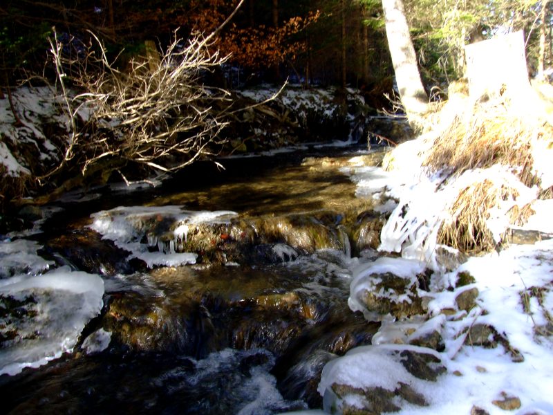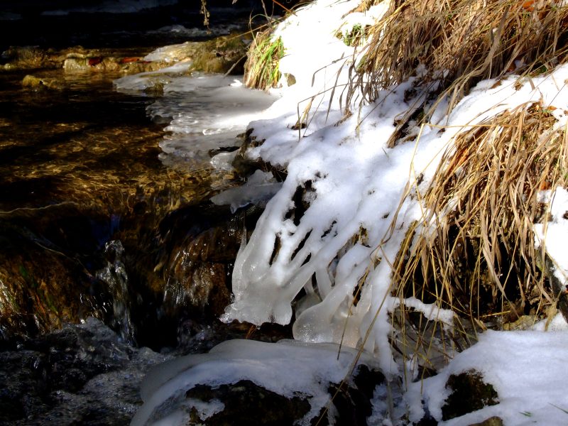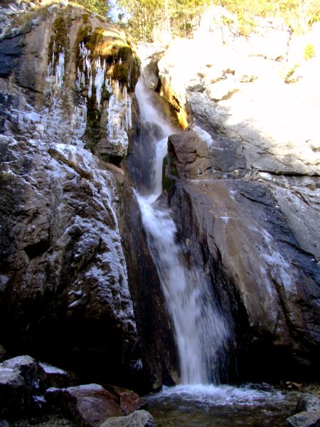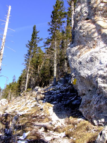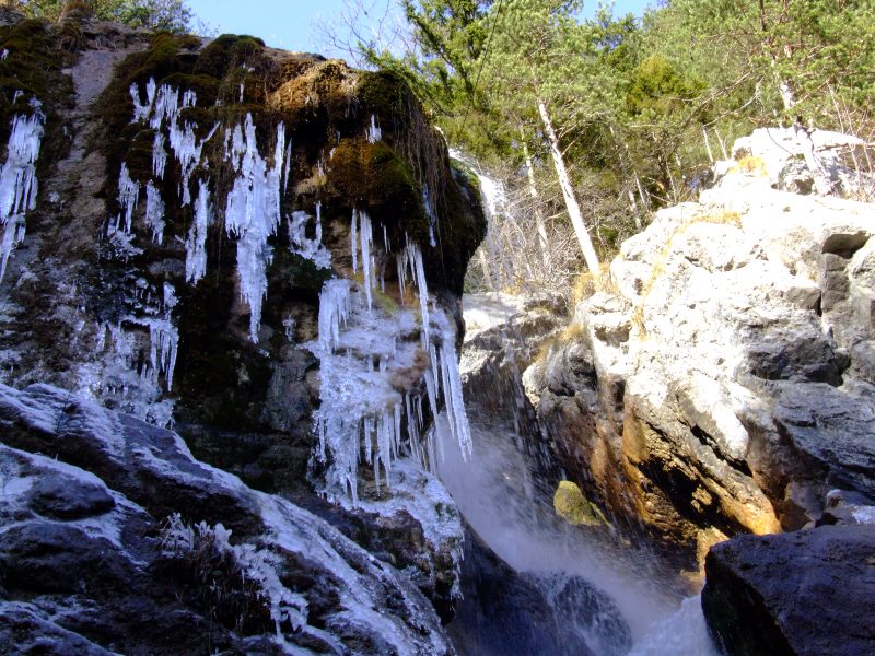 Auch hier auf schattigen Felsteilen Eiszapfen. Für mehr Eis war es in den letzten Wochen viel zu warm.
