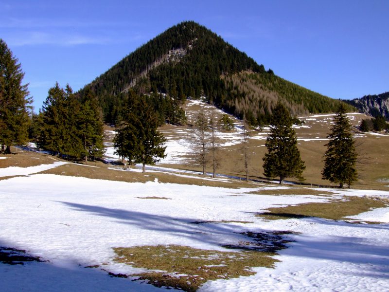 Wo das Tal eine Biegung nach links macht zweige ich rechts ab und wandere hinauf zum Öhlerschutzhaus. Bald zeigt sich wieder der Schneeberg, diesmal wolkenfrei.