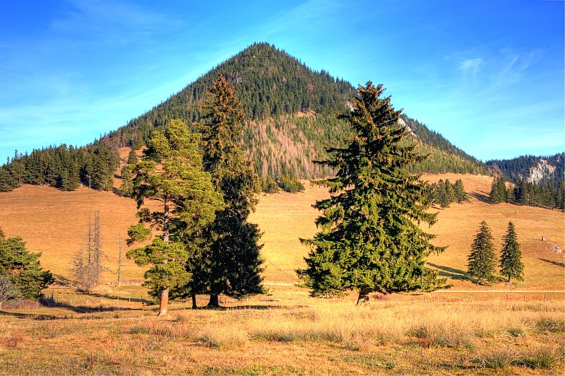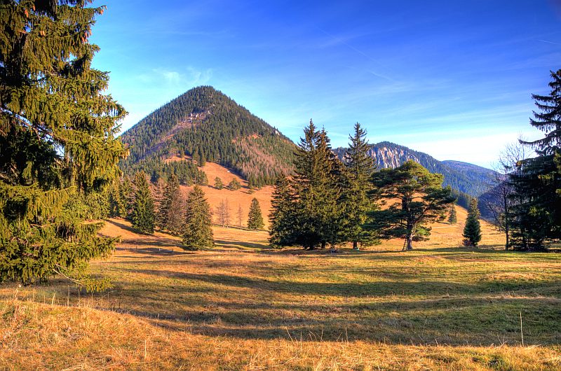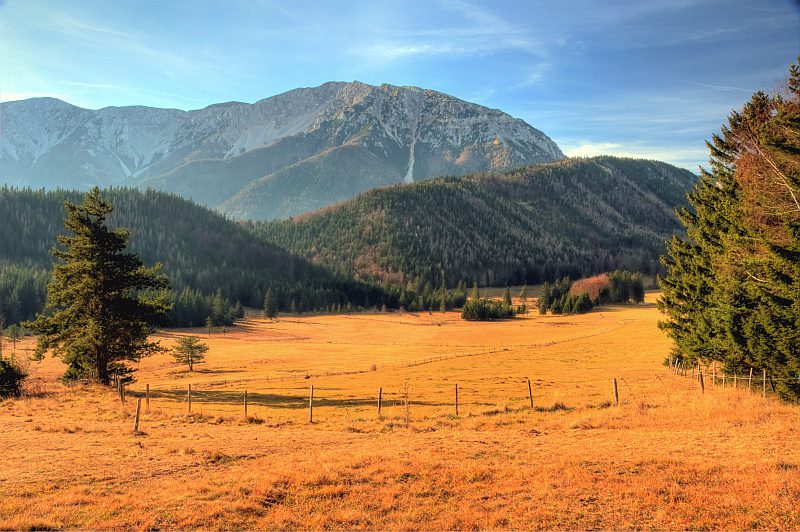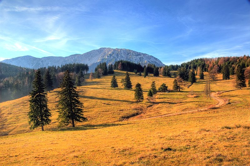 ... hinter dem (nach einem 50 m langen Waldstück) der Blick frei wird über die Mamauwiese zum Schneeberg.