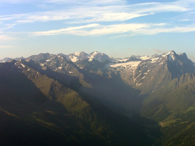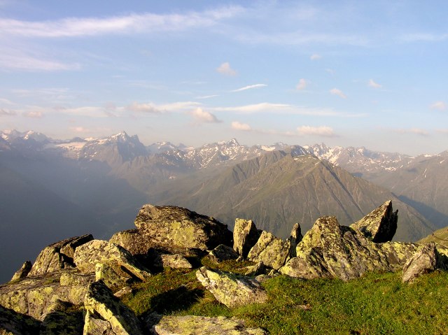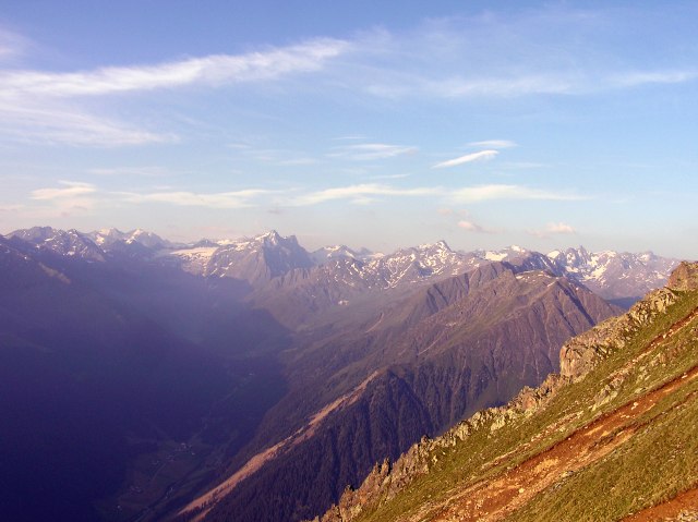 Von den Hängen des Rosskogels hat man einen herrlichen Blick ins Lüsenser Tal mit dem Lüsenser Ferner. Direkt hinter dem Gletscher Rinnenspitzer (3.000 m), Berglas Spitze (3.123 m) Hinterer Brunnenkogel (3.325 m), rechts davon der markante Gipfel ist der Lisenser Fernerkogel (3.298 m). Es schauen am Horzont aber noch weitere, fernere Gipfel hervor, am ehesten wohl links die Ruderhofspitze (3.474 m) und rechts der Schrankogel (3.497 m).