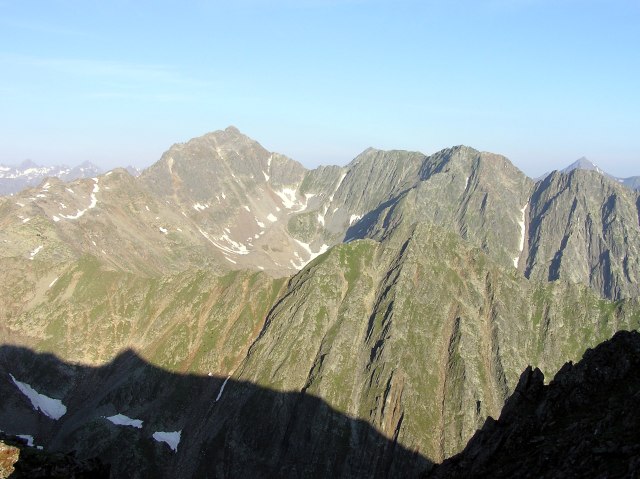 Am Westgrat, knapp vor dem Gipfel: Blick nach Nordwesten zur Peider Spitze (2.808 m) und zu den Schlossköpfen (2.660 m)
