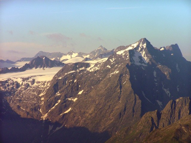 Zoom in die Stubaier Alpen. Der höchste markante Gipfel auf diesem Ausschnitt ist die Grubenwand (3.173 m). Rechts vor dem Gipfel eine kleine Zacke: Zischgeles, der sich davor projiziert und daher kaum auszunehmen ist.