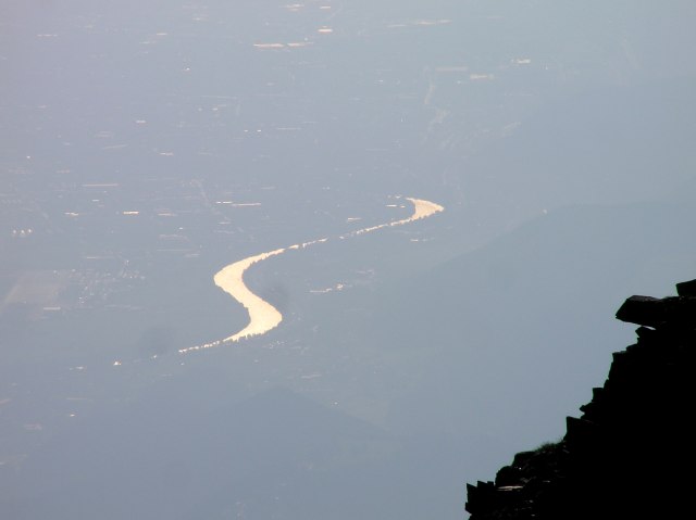 Zoom ins Tal: Der Inn spiegelt sich so hell, dass er trotz des erheblichen Dunstes zu sehen ist.