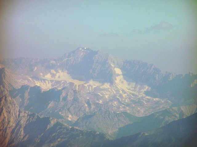 Zoom zur Zugspitze (2.962 m). Der helle Lichtfleck muss wohl ein Reflex an einem Fenster der Seilbahnstation sein.