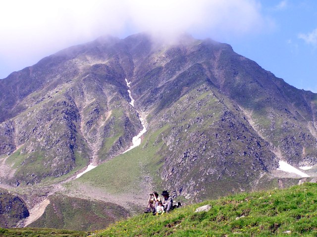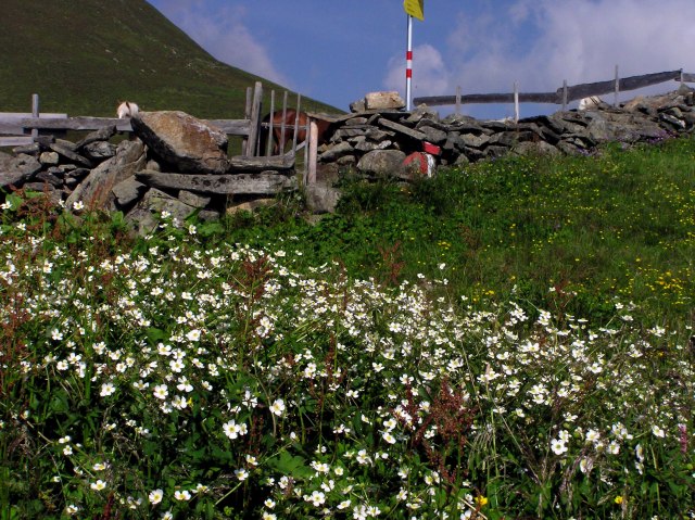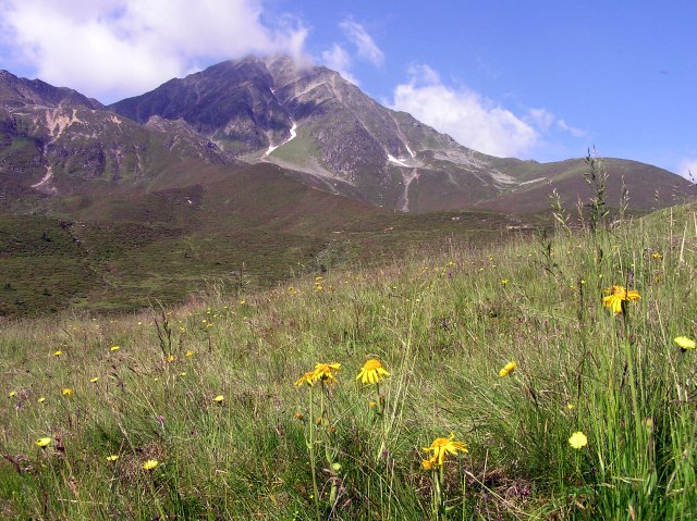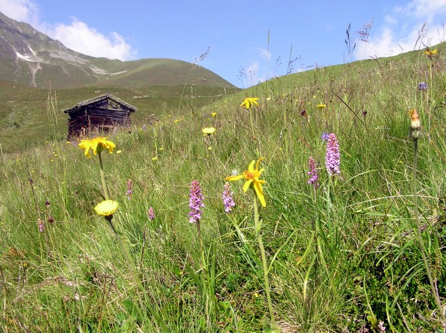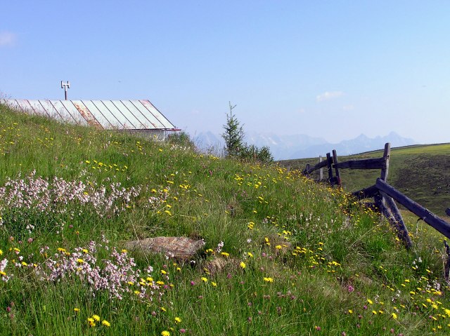 Bergwiese unter der der Krimpenbachalm, mit Rosskogel im Hintergrund