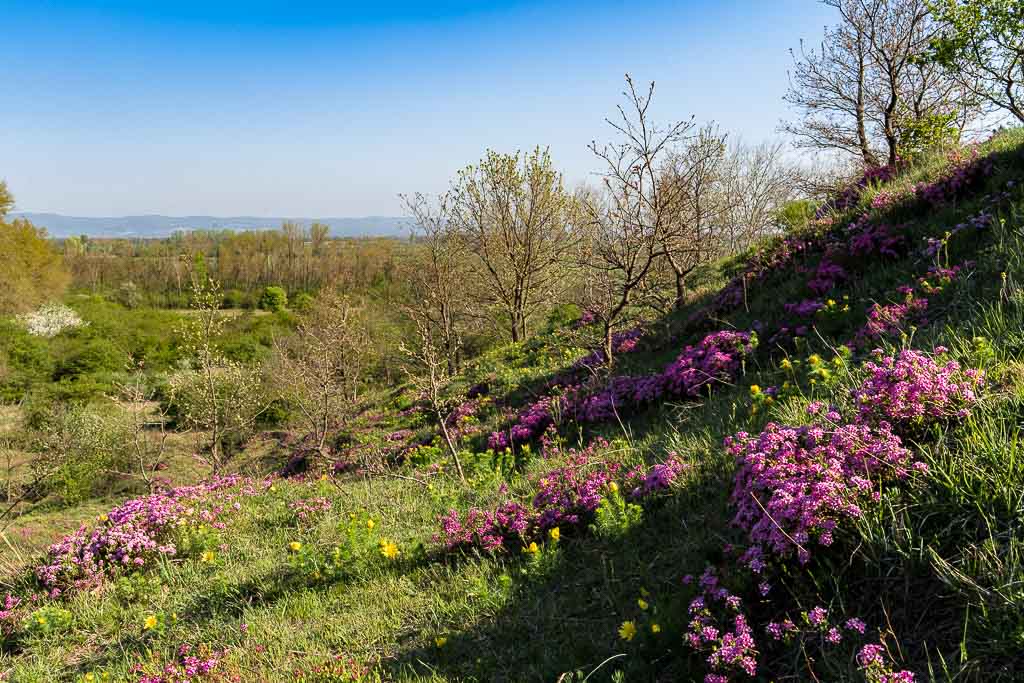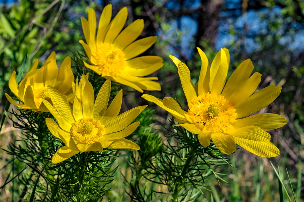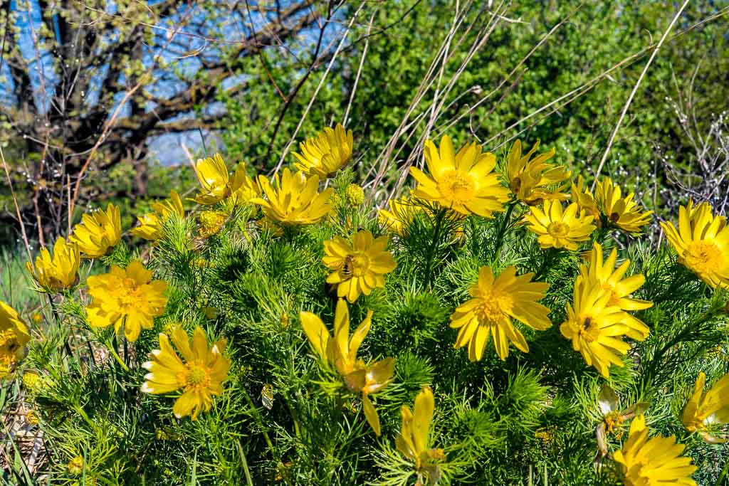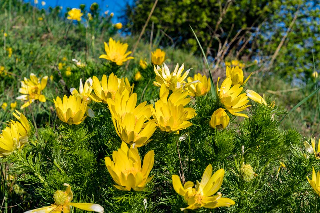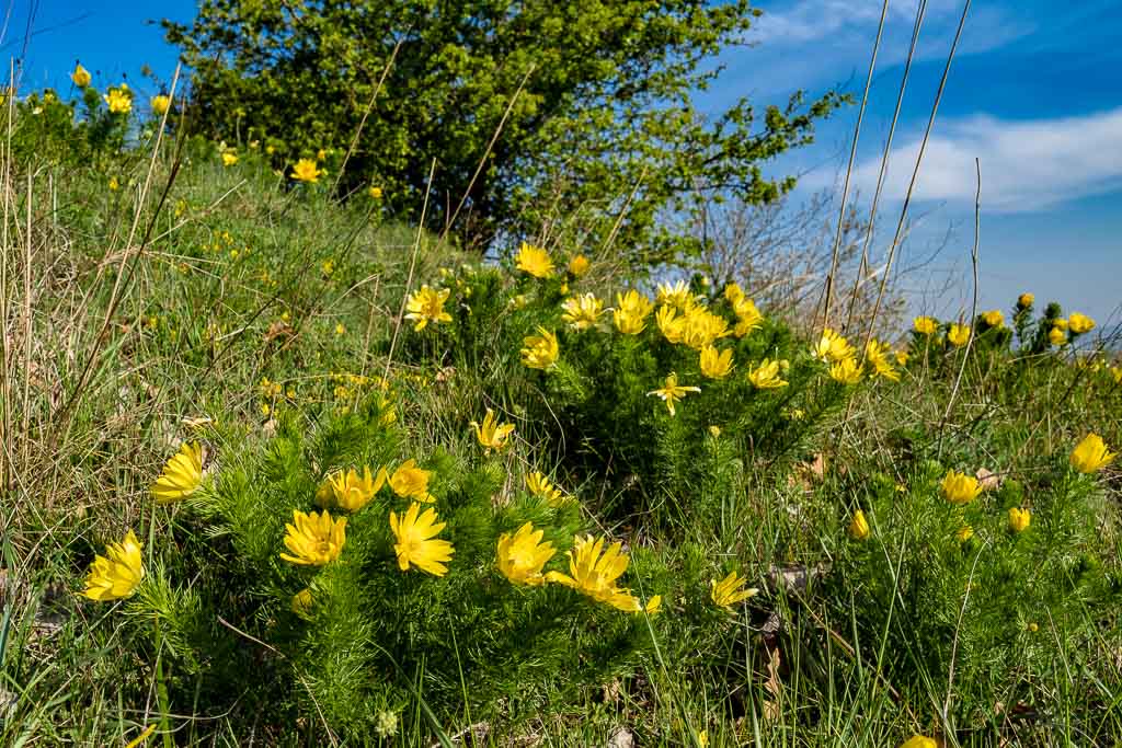 Sie wachsen in großer Menge hier, unter anderem an diesem Steilabhang. Die gelben Blumen sind Frühlings - Adonisröschen (Adonis vernalis)