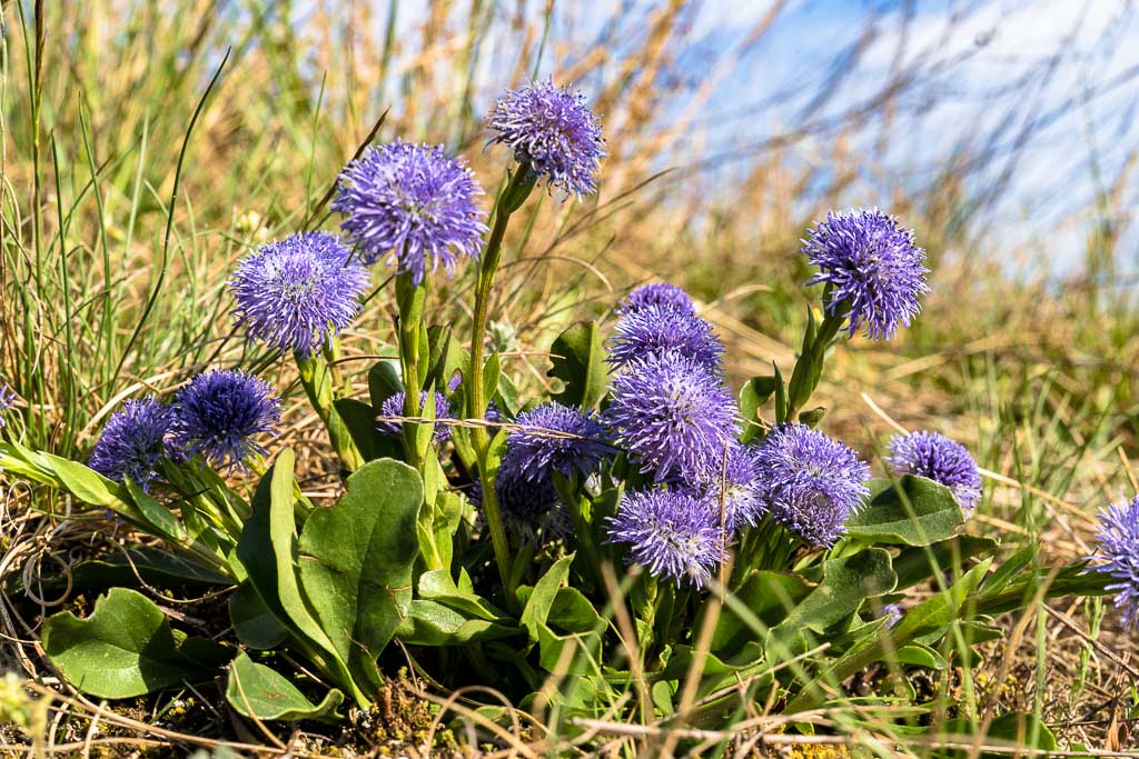 Steinröschen (Rosmarin Seidelbast, Daphne cneorum) und Kugelblumen