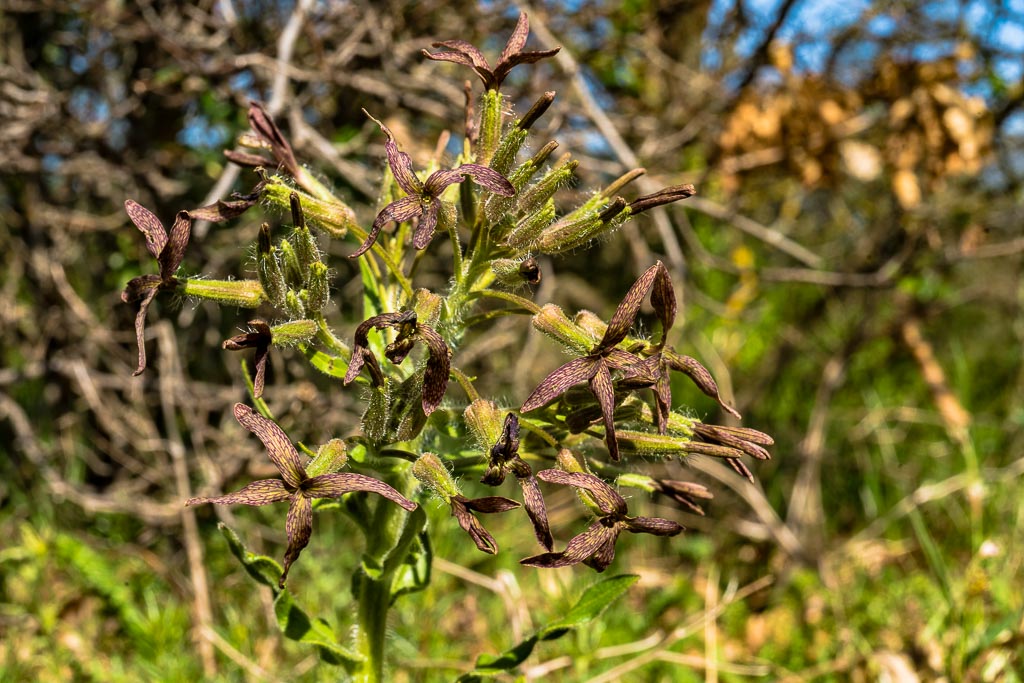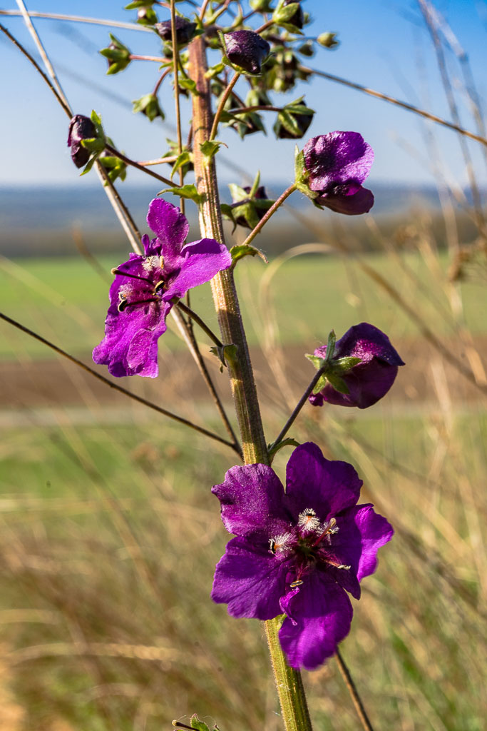 Auf der anderen Seite des Hügels, neben dem Weg, einige Exemplare der Purpur - Königskerze (Verbascum phoeniceum), die gerade zu blühen beginnen.