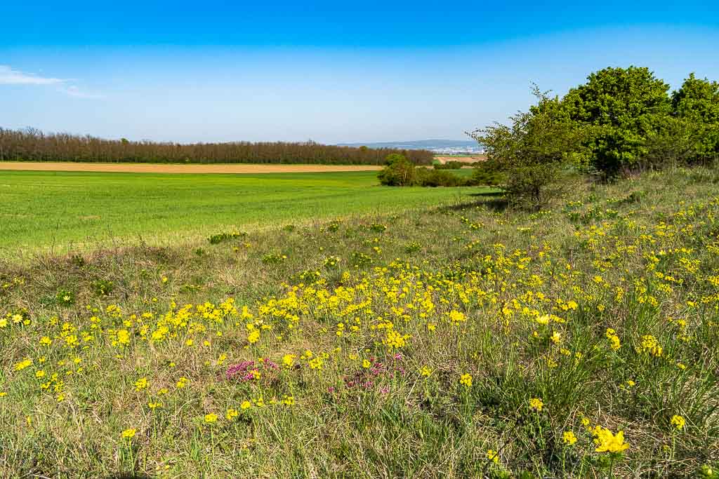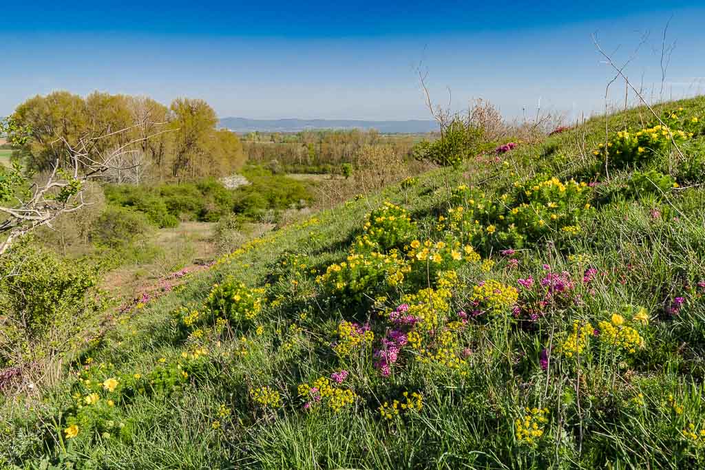 Am Rand des Gebietes wächst wieder, so wie beim Thenauriegel, Zypressenwolfsmilch (Euphorbia cyparissias) in Massen.