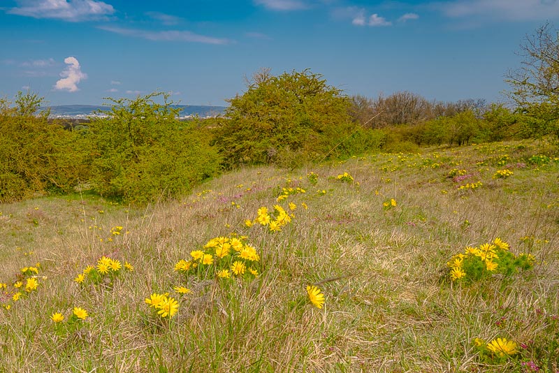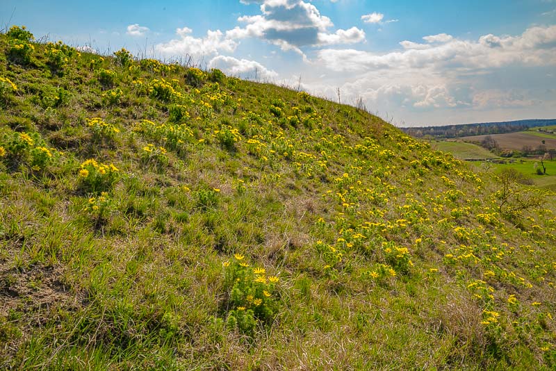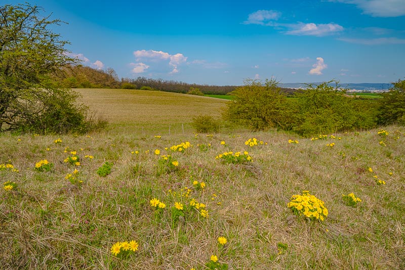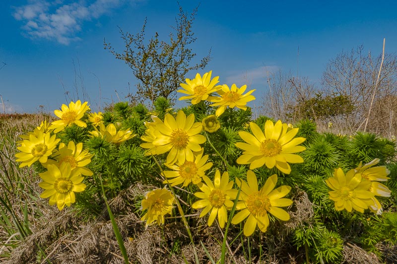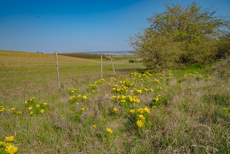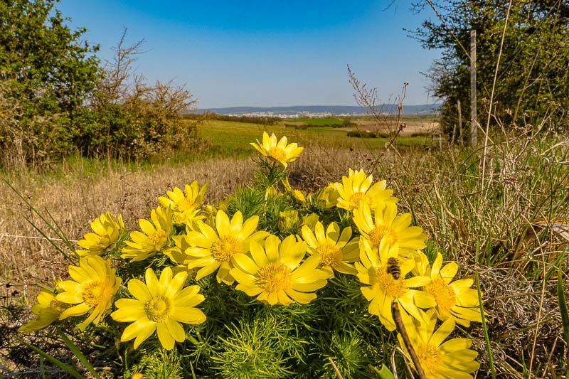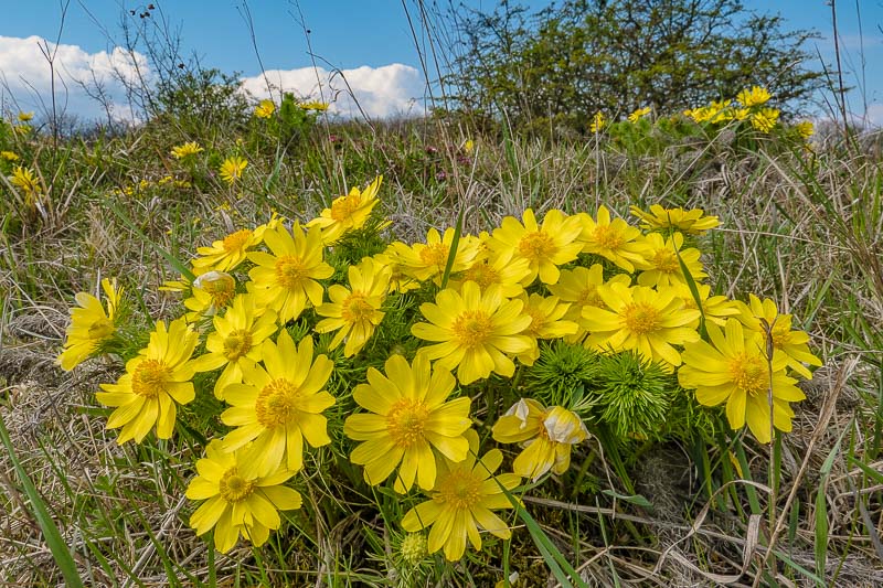 Von Ferne sehe ich gelbe Flecken am Hang etwas weiter hinten - und beschließe, mir das aus der Nähe anzusehen. Es sind Frühlings - Adonisröschen (Adonis vernalis)