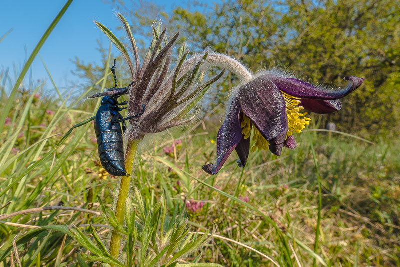 Ein schwarzblauer Ölkäfer (Meloe proscarabaeus) besucht eine Schwarze Küchenschelle (Wiesen-Küchenschelle, Pulsatilla pratensis)