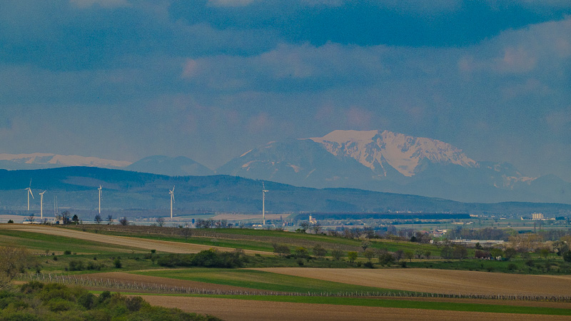 Schneeberg, hinter den Windrädern bei Mattersburg.