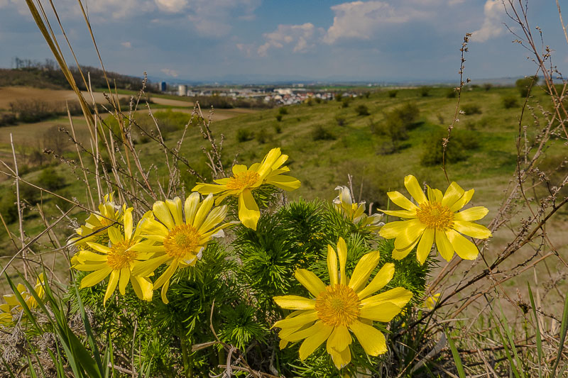 Frühlings - Adonisröschen (Adonis vernalis) und der Blick nach Eisenstadt und zum Leithagebirge.