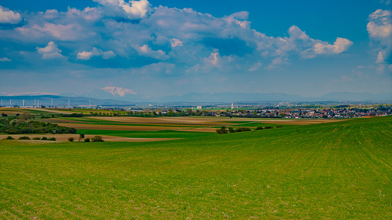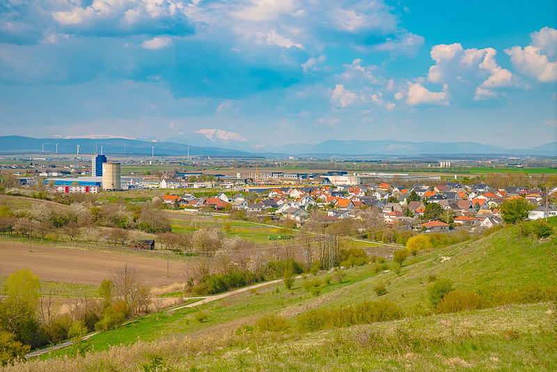 Blick über den Grenzort zur ungarischen Grenze, Klingenbach, bis zu Rax, Schneeberg und Hohe Wand.