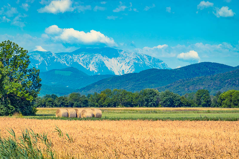 6.7.2022: Out with the mountain bike. First heading for Weikersdorf, then the main road to Puchberg, branching off at the outskirts along the Mori beck. Some of the grain is cropped already