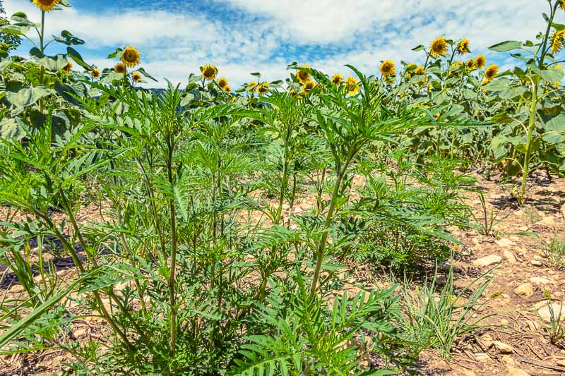 Near the prominent group of trees surrounding a hollow, a big group of ragweed plants is growing, the pollen of which are highly allergenic.