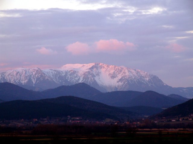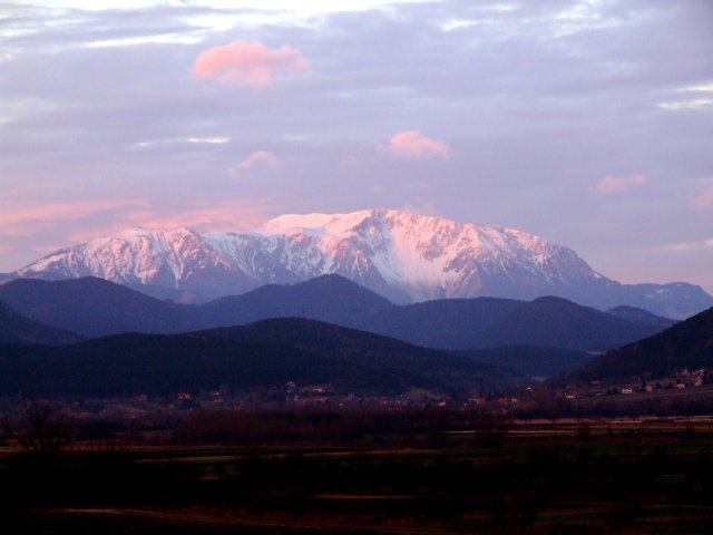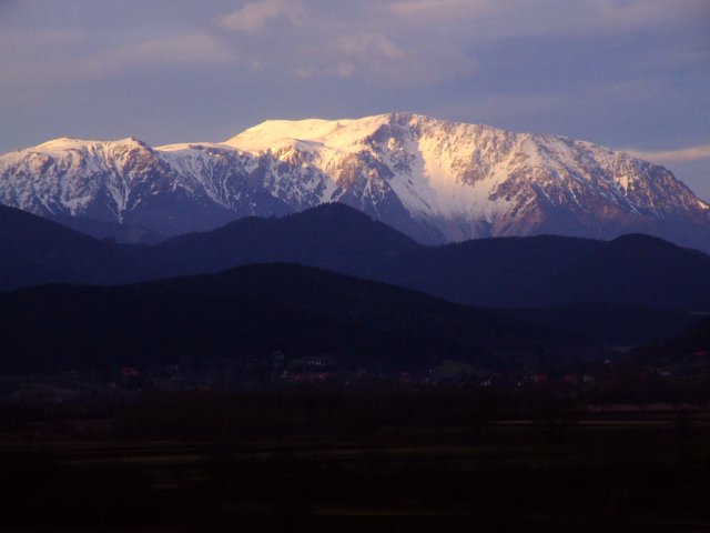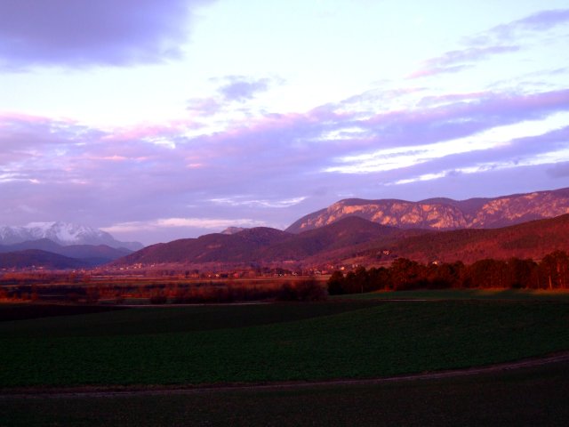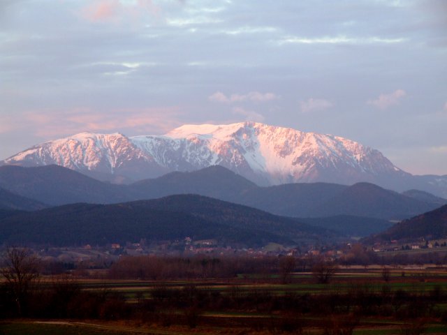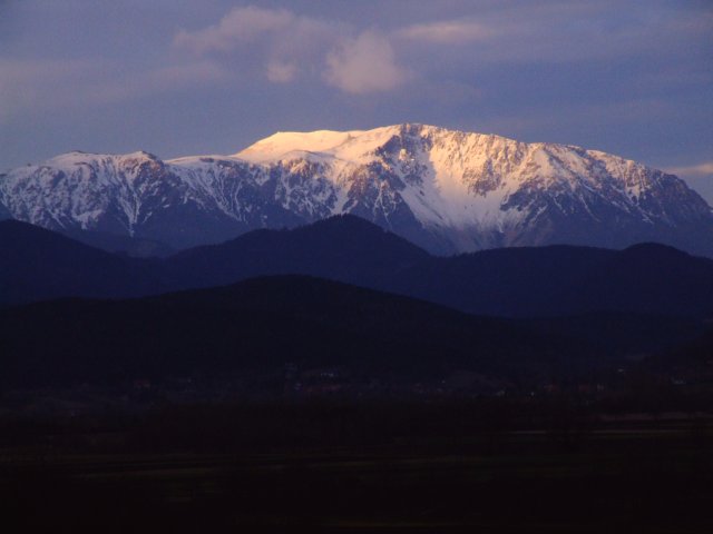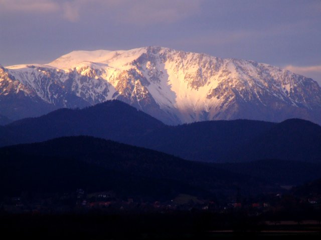 Während nun erste Sonnenstrahlen auf die Felder fallen und die westlichen Teile der Hohen Wand mit dem Kienberg davor, ist der Schneeberg nun wieder im Schatten einer Wolke.