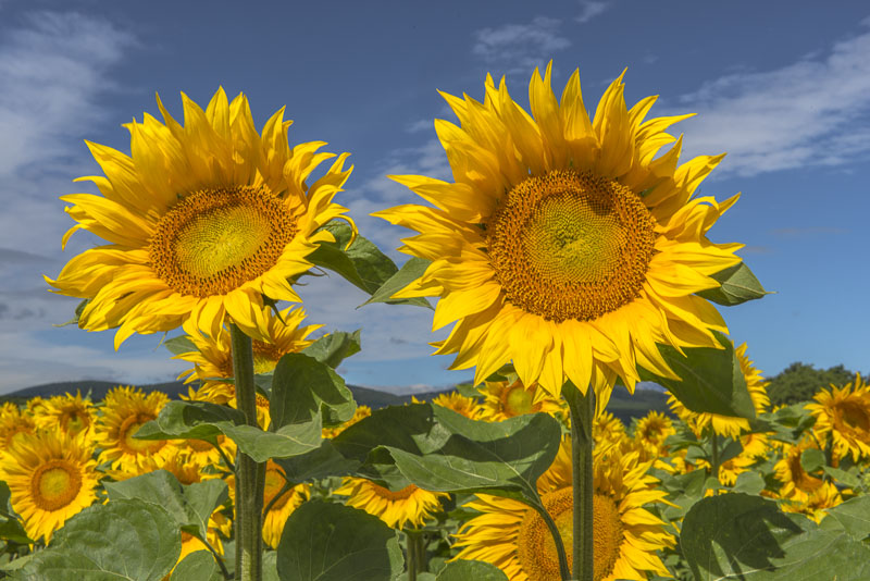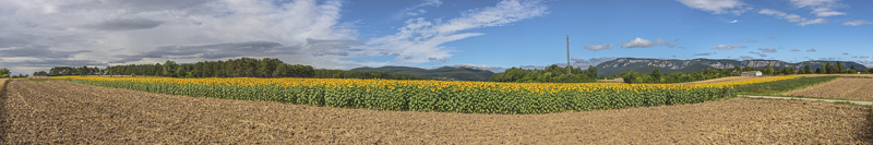 Panoramabild des Sonneblumenfelds bei St. Egyden. Hierher oder ins Bild klicken für eine größere Darstellung.