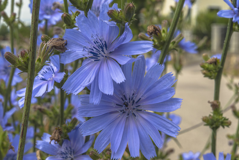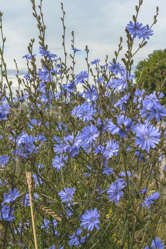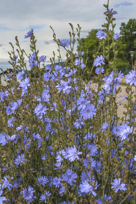 Zurück am Ortsanfang von Winzendorf. Blühende Wegwarten (Cichorium intybus).