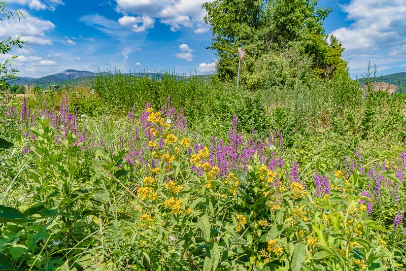 17.7.2019. Bei der Straßenbrücke über den Moribach blüht Blutweiderich und Gilbweiderich üppig.