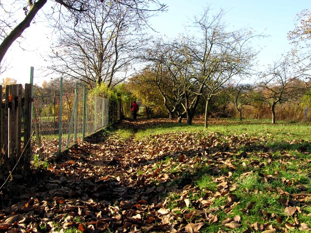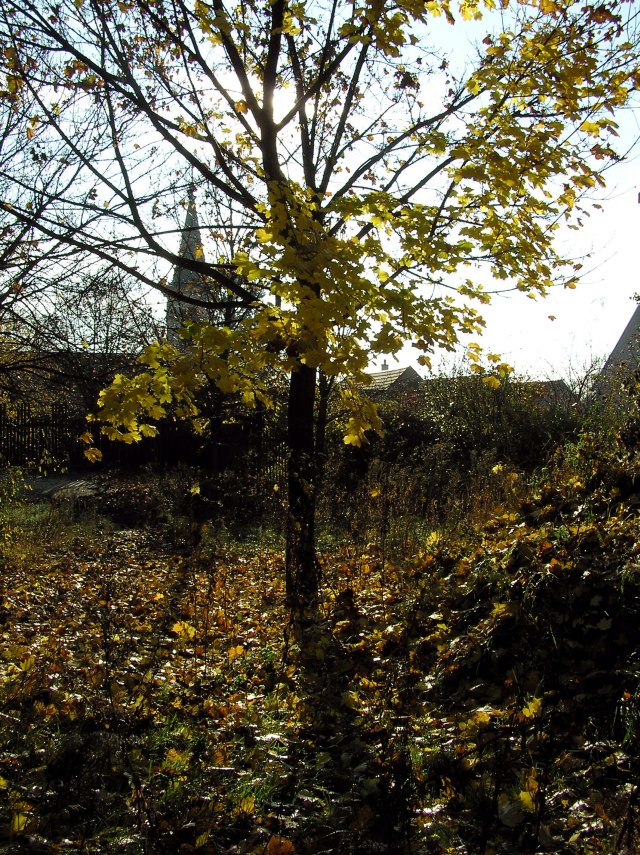 On the area of the former playing ground. We walk there on Mathildensteig. In the background the spire of the old village church.