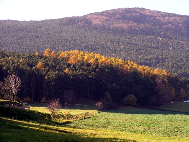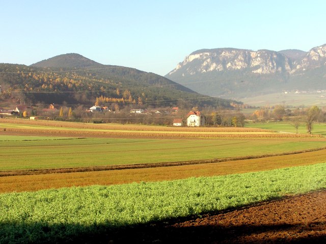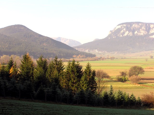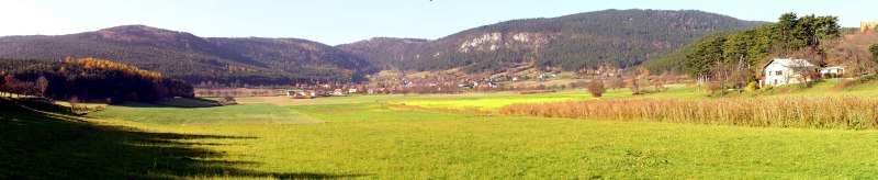 Our path now leads down the mountain on the opposite side, heading for Netting; however, we turn to the right and walk on the slopes of Mitterberg to Teichmuehle. View to Hohe Wand and Stollhof.