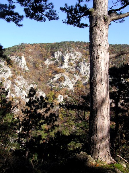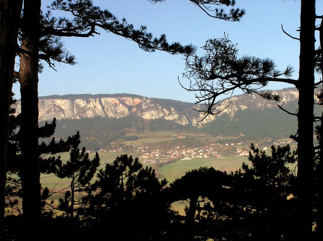 ... and in between the pines a view to Hohe Wand with Stollhof in the foreground