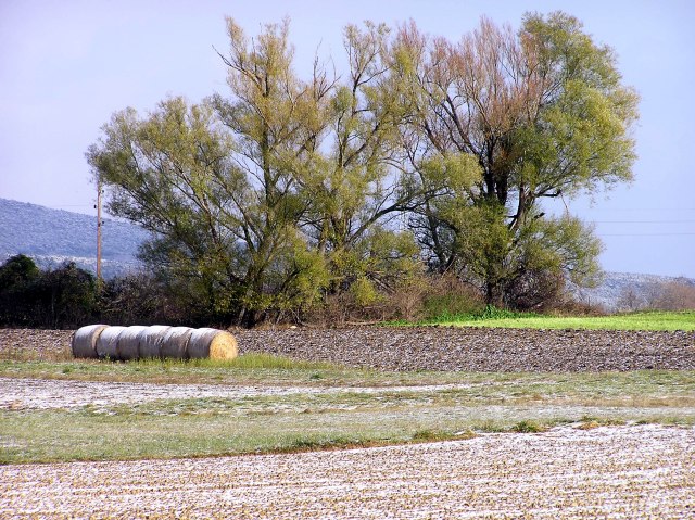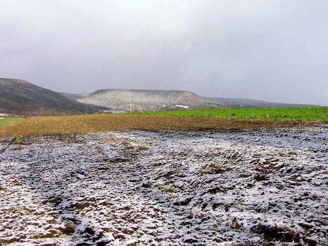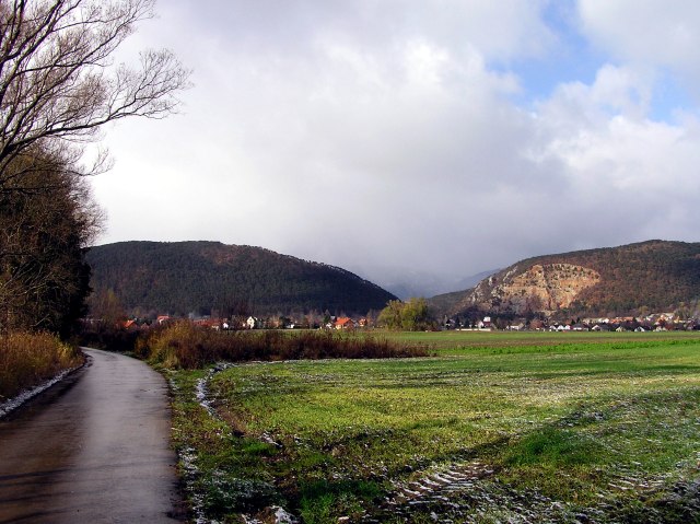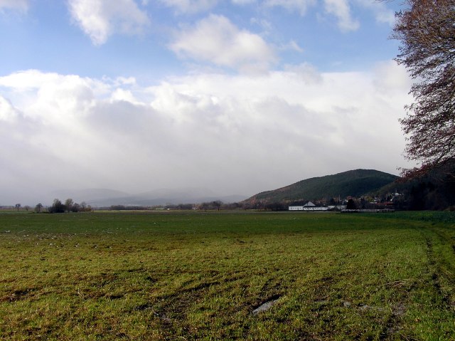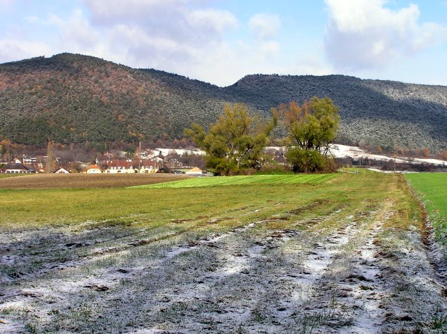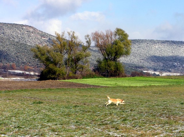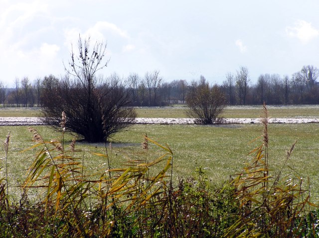 The last days the weather is windy and rainy, since yesterday it grew much colder resulting in snowing. Between the snow showers partly being very dense there are some sunny spells. At noon I start for a short walk with the dog over nearby meadows and fields.