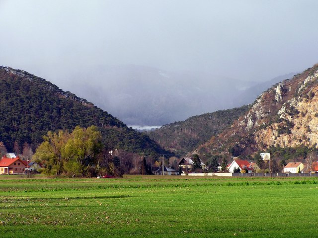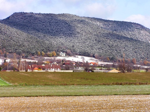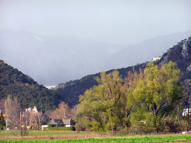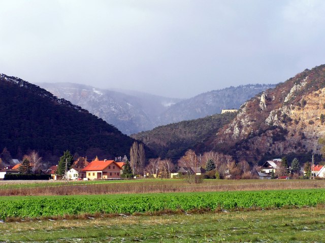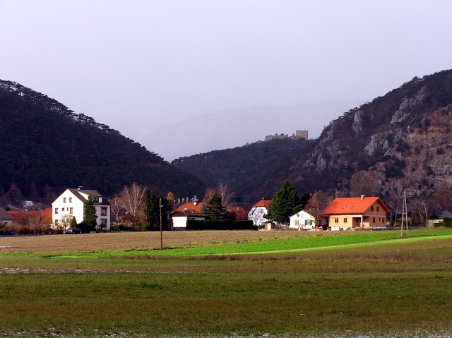 Sun on ruin Emmerberg, on Hohe Wand already snowing
