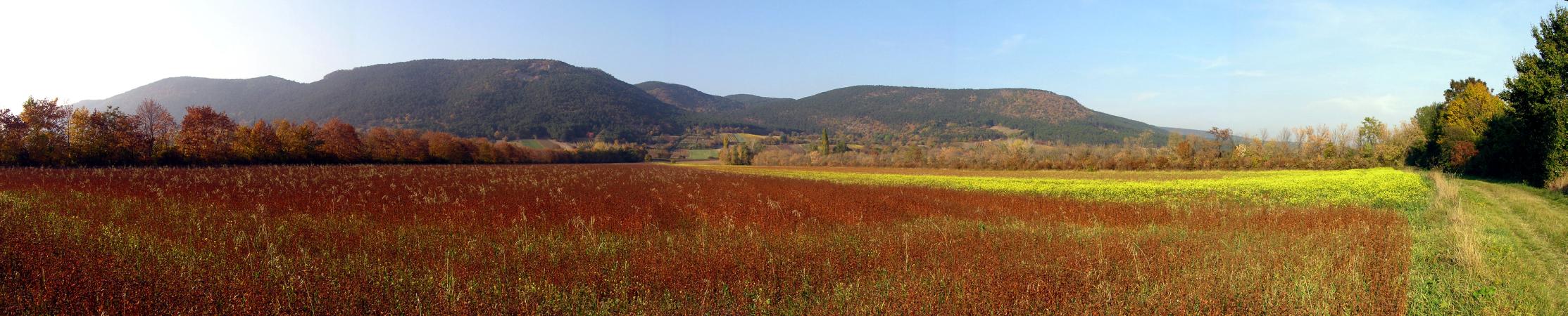 Hinter dem Bahndamm wieder Buchweizen und Herbst - Raps, im Hintergrund die Fischauer Berge.