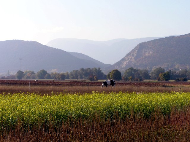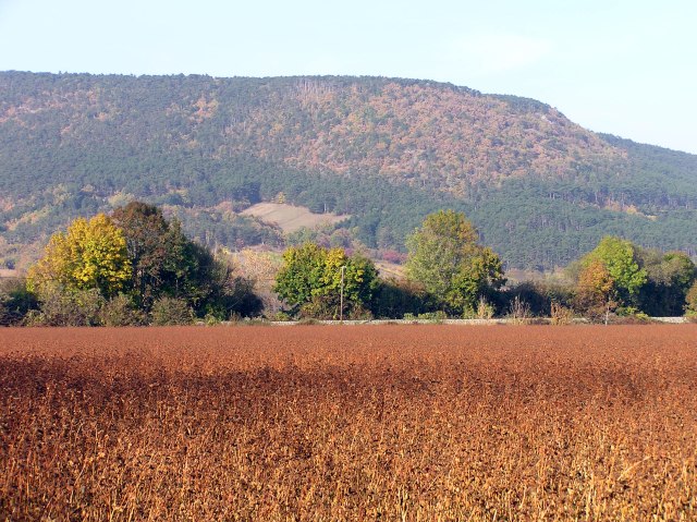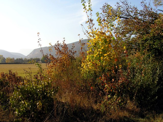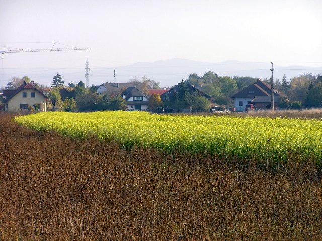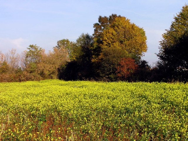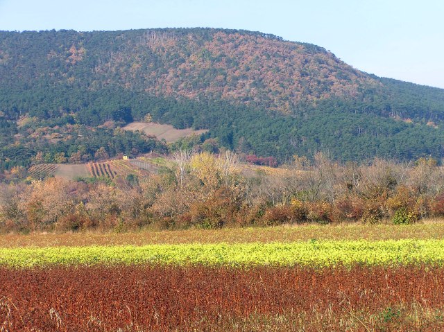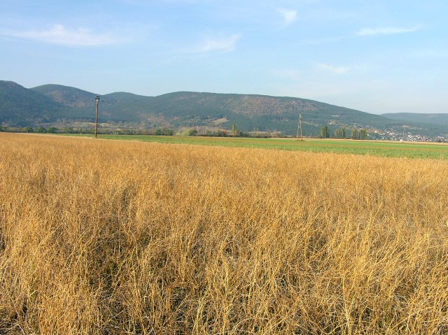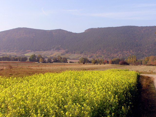 Hinter dem Bahndamm wieder Buchweizen und Herbst - Raps, im Hintergrund die Fischauer Berge. Ins Bild klicken für eine größere Darstellung.