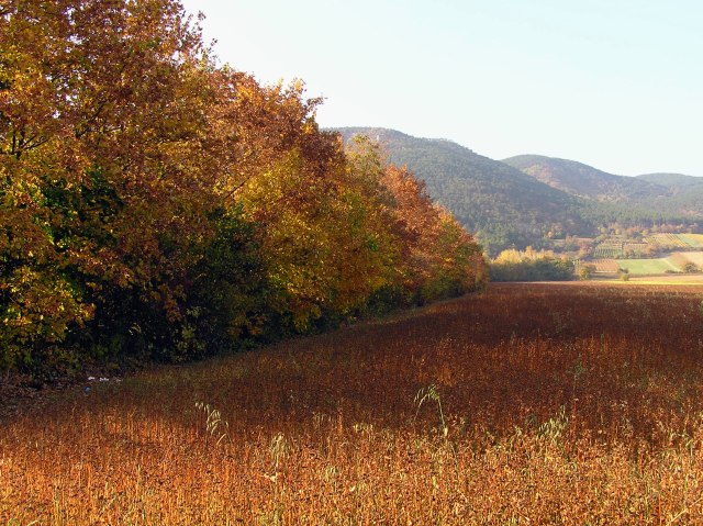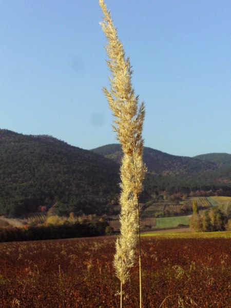 Schilfgras - Samenstände. Blick über ein reifes Buchweizenfeld zu den Fischauer Bergen.