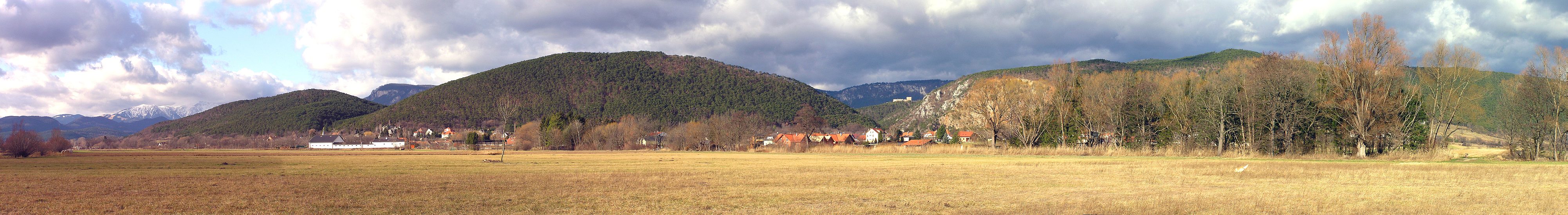 Panorama von Winzendorf. Ganz links der Schneeberg, dann Mitterberg, Prossetschlucht und Schlossberg.