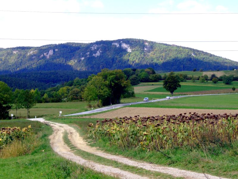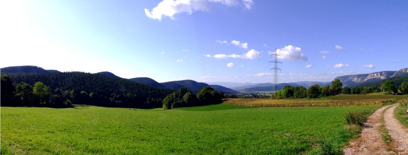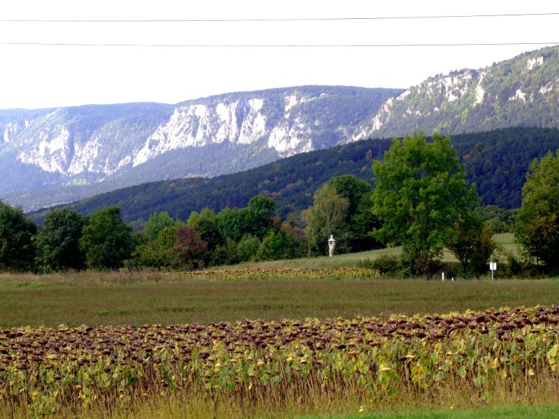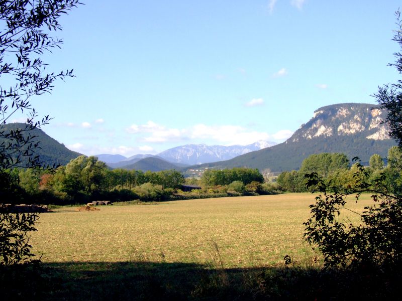 Blick vom Ausgangspunkt meiner Wanderung nach Süden: links die Fischauer Vorberge, rechts die Hohe Wand.