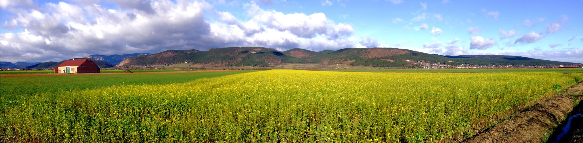 Panoramic view with Weikersdorf to the left and Bad Fischau/Brunn far right, Fischau´s mountains behind, far left in the background Hohe Wand, Schneeberg wrapped in clouds.