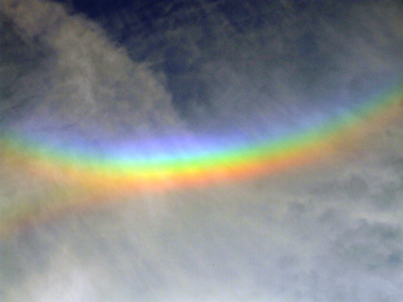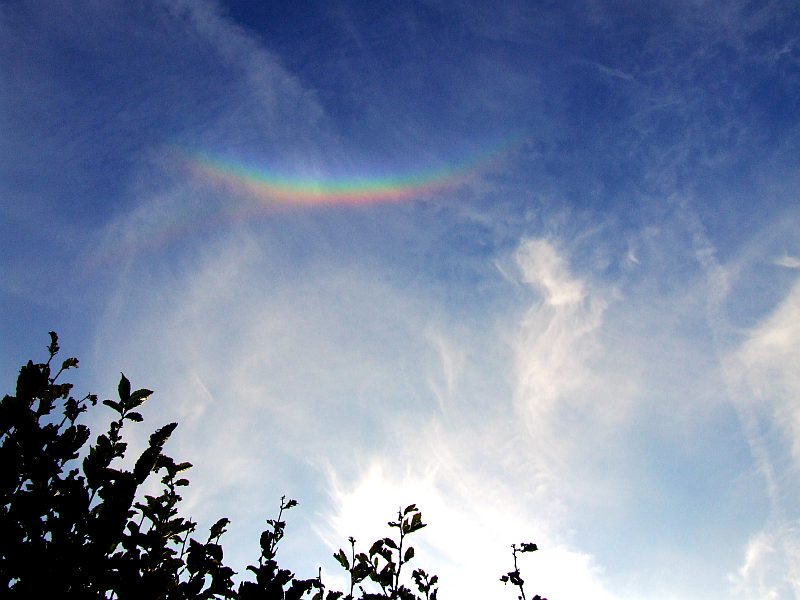 At a pause during my praxis work I go out into the garden, at 17:43 p.m. For some reason, I look high up into the sky. There are white cirrus clouds advertising bad wheather (which occured a day later). In midst this cirrus cloud there is a light, short, coloured bow like a rainbow.