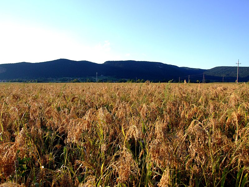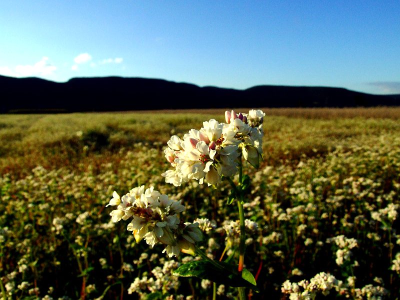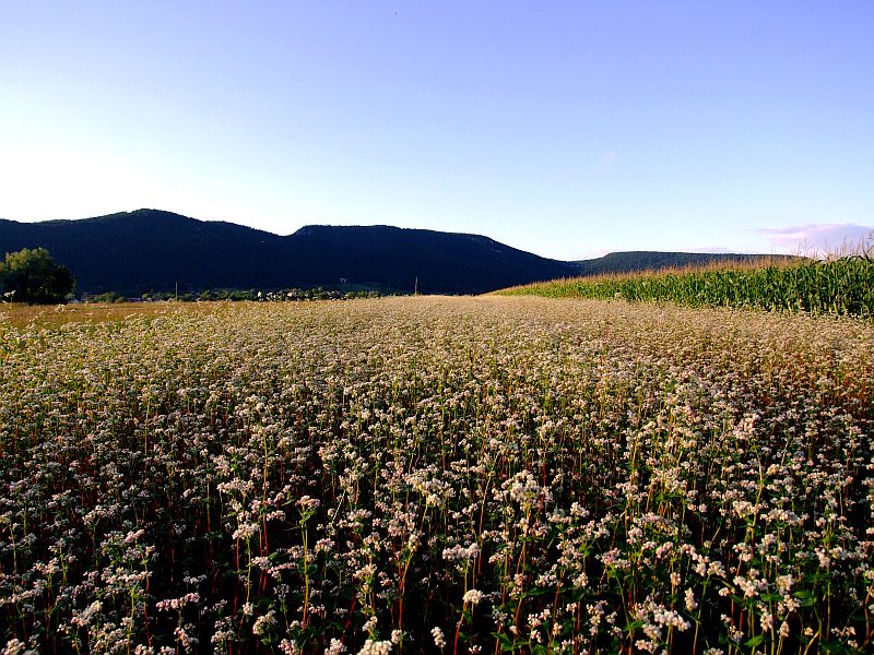 View back to the Fischau mountains. This white flourishing buckwheat field is nicely lit by the evening sun.