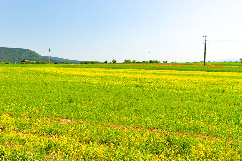 Blooming oilseed rape as seen from the last houses of Winzendorf