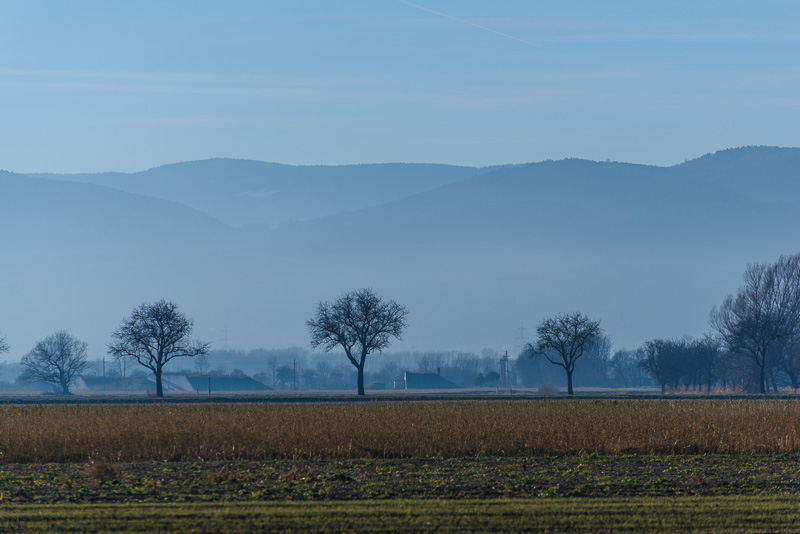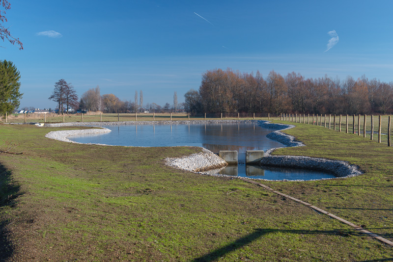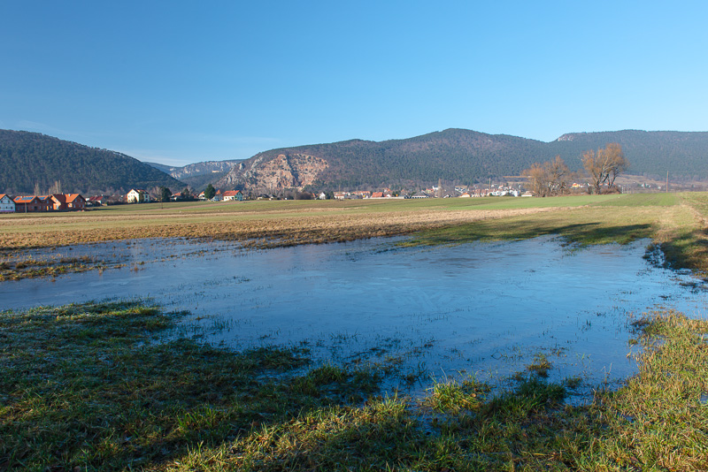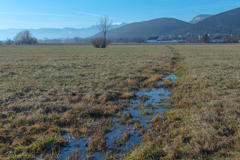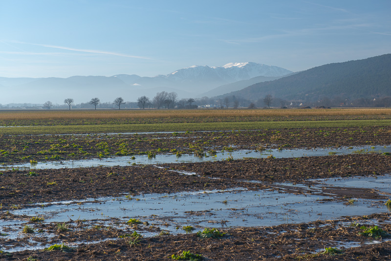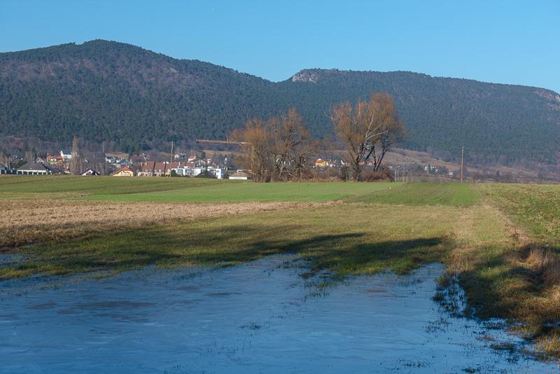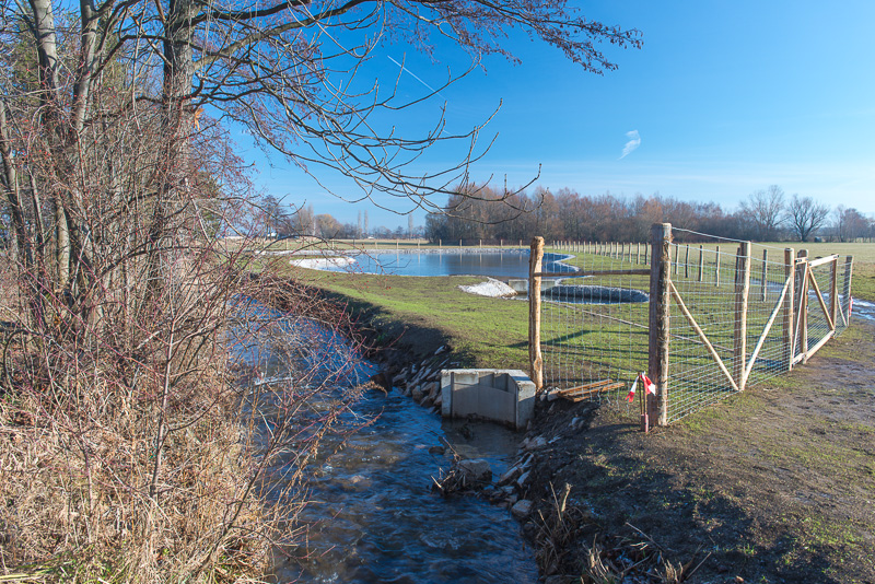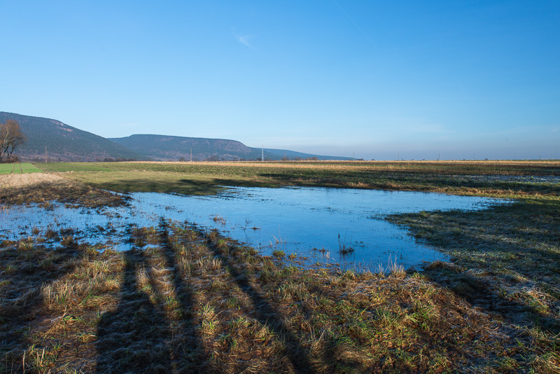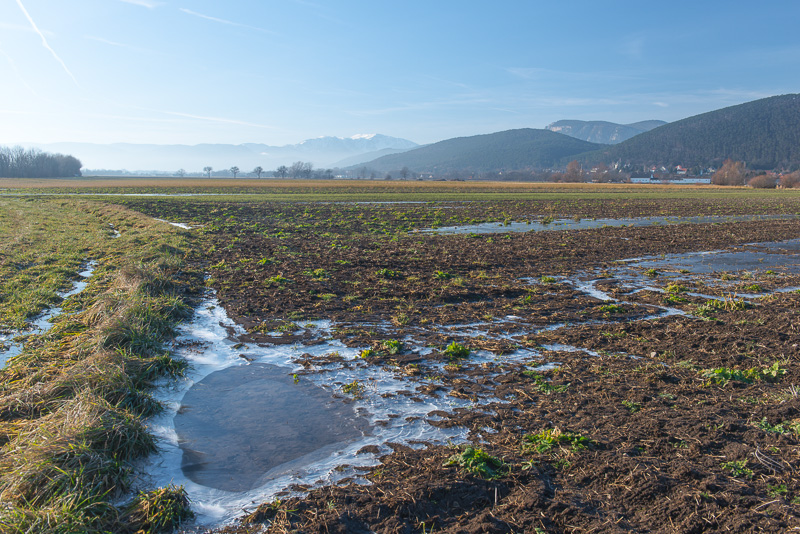 After a mix of snow, rain, freezing rain and subsequent thaw up to 10 °C, last night it became clear and cold, freezing the puddles on the fields.