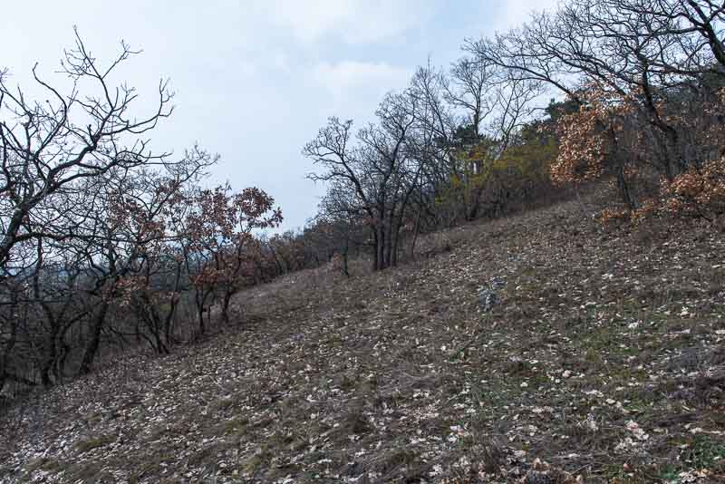 Der Wiesenhang, mit Eichen und Dirndlsträuchern.