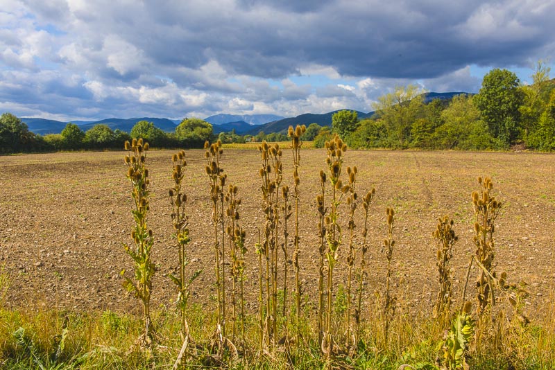Fruchtstände der Wilden Karde (Dipsacus fullonum) neben dem Weg.