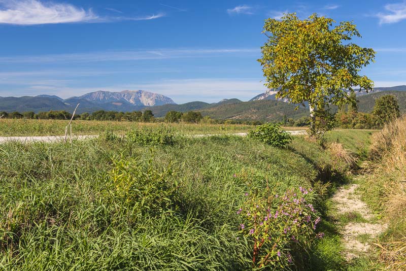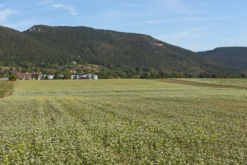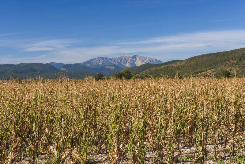 Noch stehen einige Maisfelder, aber die Maiskolben haben braune Blätter wie im Oktober und kleine Körner. Dies ist eine Stelle, die im Winter oft von Lacken bedeckt ist. an anderen, trockeneren Stellen stand der Mais nicht einmal kniehoch - mittlerweile ist er dort schon abgemäht.