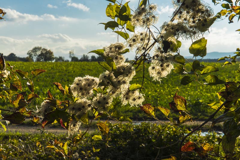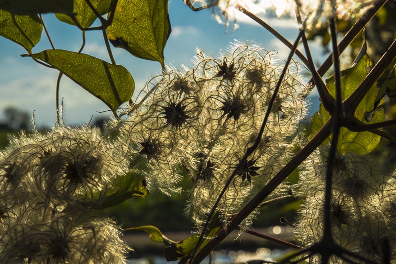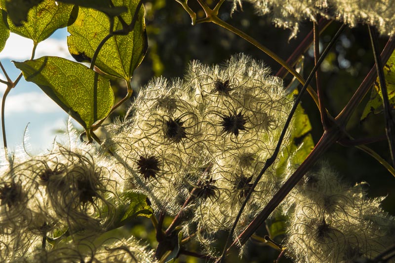 In the bush near the road the clematis has got its pretty fruits.