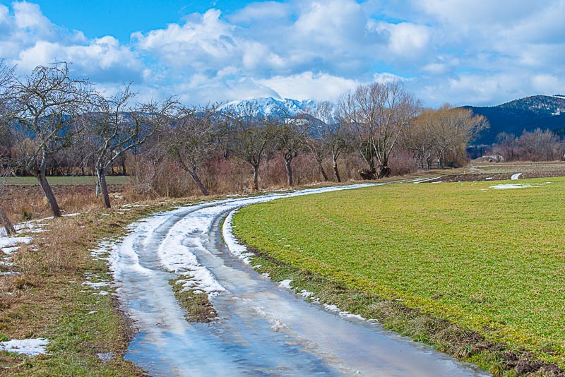 Der zusammengefahrene Schnee ist nicht begehbar: er ist von einer fast 10 cm dicken Schicht aus Wasser und Schneematsch bedeckt.