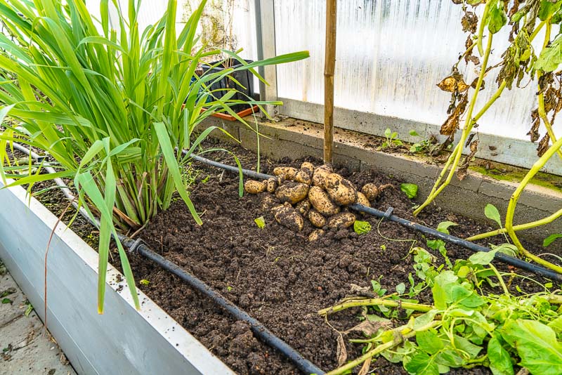 ... und teste, ob die Erdäpfel, die ich im Juli an Stelle der ausgewachsenen und vom Mehltau befallenen Zucchini gesetzt habe, gewachsen sind. Das schaut tatsächlich vielversprechend aus.