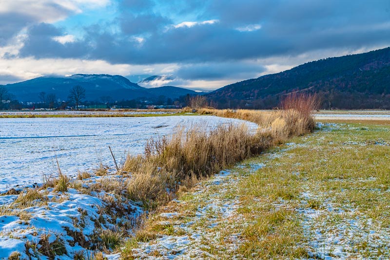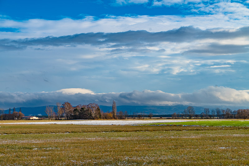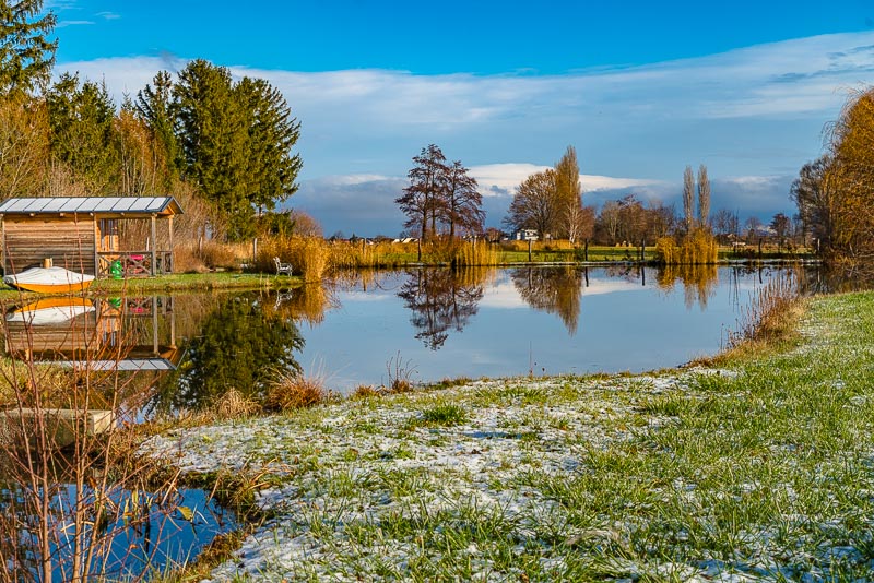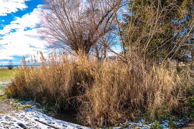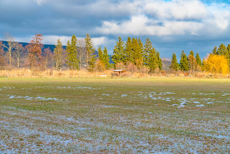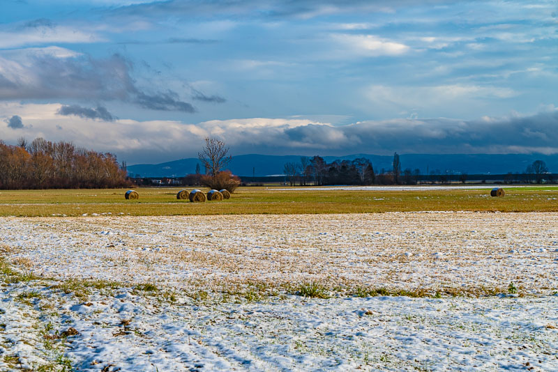 Letzte Nacht hat es geschneit. Jetzt kommt ein wenig die Sonne heraus, ich verlängere meinen Spaziergang mit den Hunden ein wenig über die Felder jenseits des Frauenbaches.