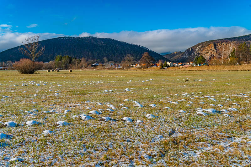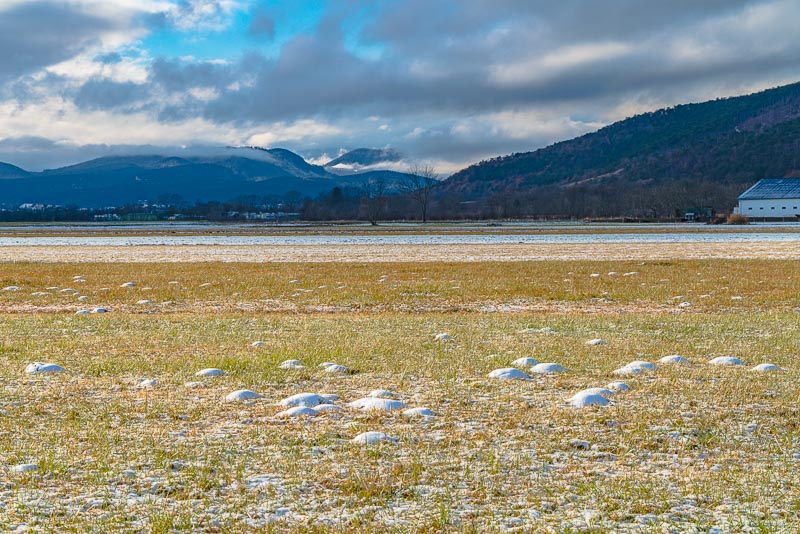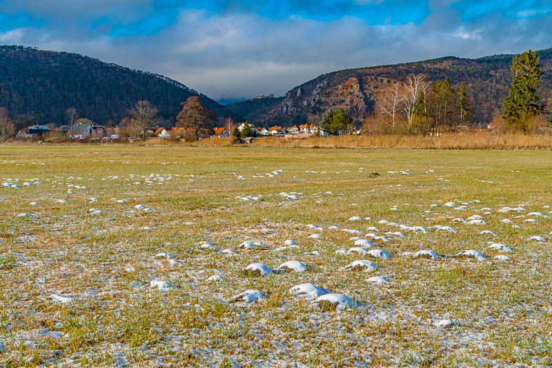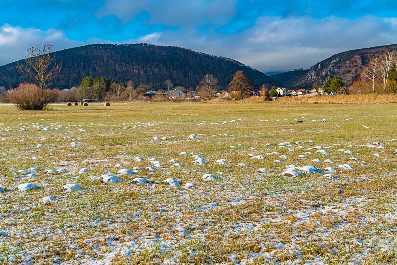 Die zahlreichen Maulwurfshügel sind noch schneebedeckt.